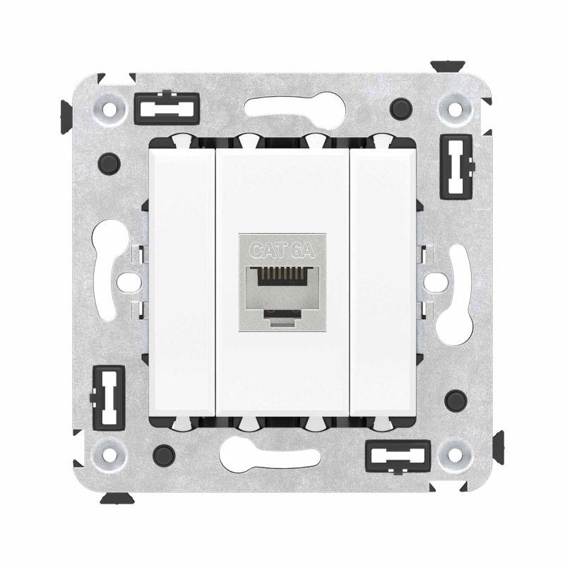 Компьютерная розетка экранированная без шторки используется для подключения компьютерной техники и соединения с патч-панелью. Предназначена для скрытого монтажа в стену, поставляется в комплекте с суппортом. Розетка RJ-45 категории 6А может использоваться для организации сетей с частотой до 500 МГц и передавать данные до 10 Гбит/с. Материал розетки – металл, термопласт. Пластиковые детали изделия выполнены в цвете "Белое облако".