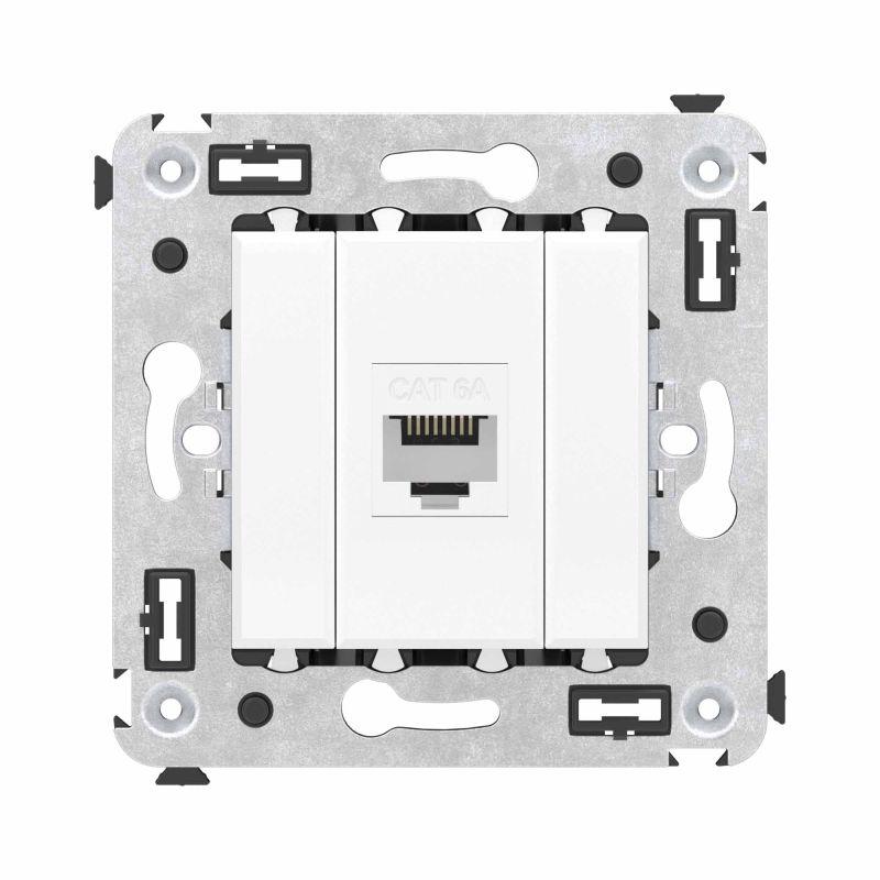 Компьютерная розетка без шторки используется для подключения компьютерной техники и соединения с патч-панелью. Предназначена для скрытого монтажа в стену, поставляется в комплекте с суппортом. Розетка RJ-45 категории 6А может использоваться для организации сетей с частотой до 500 МГц и передавать данные до 10 Гбит/с. Материал розетки – металл, термопласт. Пластиковые детали изделия выполнены в цвете "Белое облако".