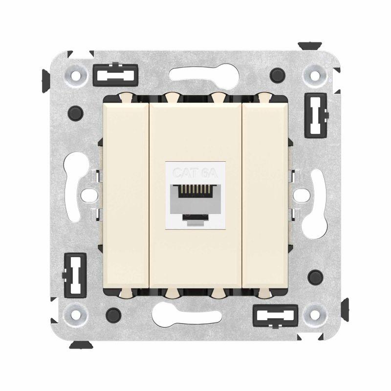 Компьютерная розетка без шторки используется для подключения компьютерной техники и соединения с патч-панелью. Предназначена для скрытого монтажа в стену, поставляется в комплекте с суппортом. Розетка RJ-45 категории 6А может использоваться для организации сетей с частотой до 500 МГц и передавать данные до 10 Гбит/с. Материал розетки – металл, термопласт. Пластиковые детали изделия выполнены в цвете "Ванильная дымка".