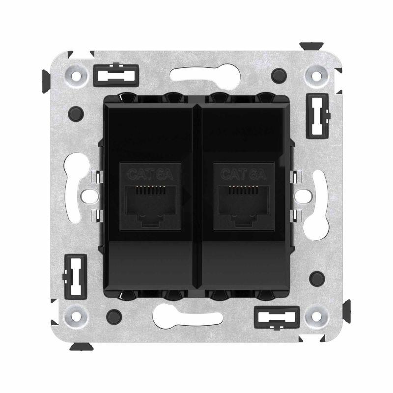 Компьютерная розетка двойная без шторки используется для подключения компьютерной техники и соединения с патч-панелью. Предназначена для скрытого монтажа в стену, поставляется в комплекте с суппортом. Розетка RJ-45 категории 6А может использоваться для организации сетей с частотой до 500 МГц и передавать данные до 10 Гбит/с. Материал розетки – металл, термопласт. Пластиковые детали изделия выполнены в цвете "Черный квадрат".