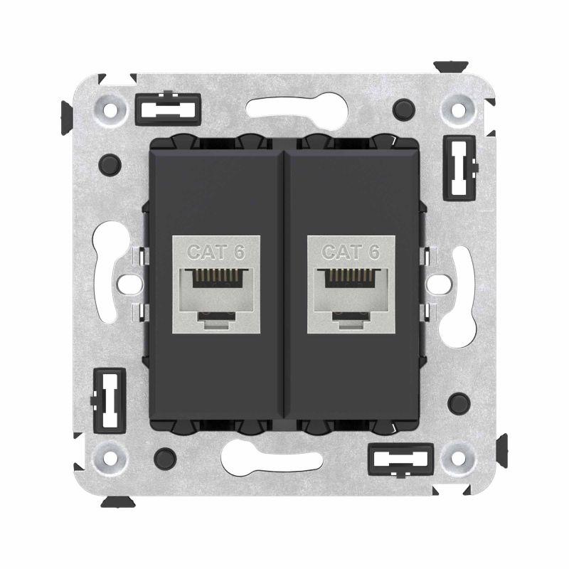 Компьютерная розетка двойная экранированная используется для подключения компьютерной техники и соединения с патч-панелью, предназначена для скрытого монтажа в стену, поставляется в комплекте с суппортом. Розетка RJ-45 категории 6 может использоваться для организации сетей с частотой до 250 МГц и передавать данные на большие расстояния. Материал розетки – металл, термопласт. Пластиковые детали изделия выполнены в цвете "Черный матовый".