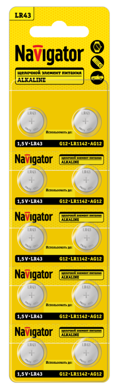 Описание: Элемент питания алкалиновый "таблетка" 95 662 NBT-05 (LR43 AG12 LR1142 BP10) (блист.10шт) Navigator 95662