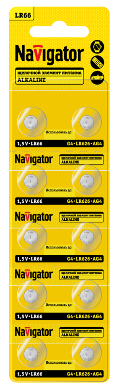 Описание: Элемент питания алкалиновый "таблетка" 95 666 NBT-09 (LR66 AG4 LR626 BP10) (блист.10шт) Navigator 95666