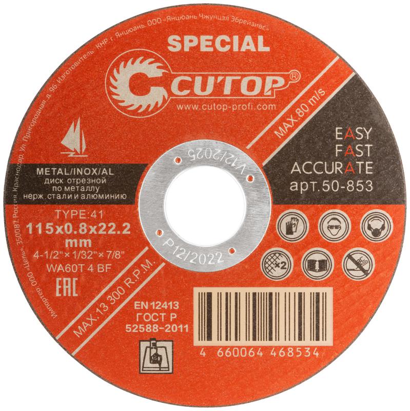 Диск отрезной профессиональный специальный по металлу нержавеющей стали и алюм. Special Т41-115х0.8х22.2мм Cutop 50-853 - условия доставки