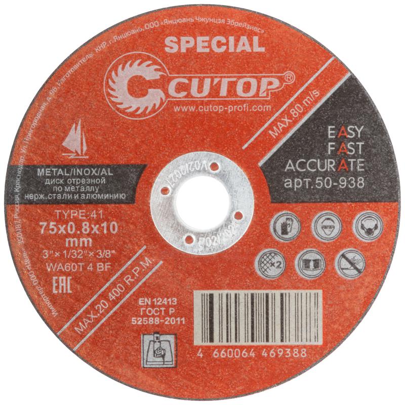 Описание: Диск профессиональный специальный отрезной по металлу нержавеющей стали и алюминию Special Т41-75х0.8х10.0мм Cutop 50-938