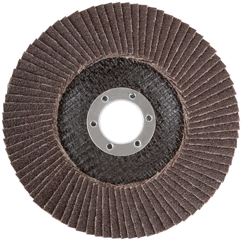 Тип 2 (Конический). 80 лепестков. Для УШМ. Посадочный диаметр 22,2 мм. Абразивный слой из кальцинированного оксида алюминия увеличивает скорость обработки поверхности. Для сухого шлифования и снятия краски с нержавеющей стали, инструментальной стали, чугуна, цветных металлов, пластика и дерева. Материал: абразивный слой - кальцинированный оксид алюминия, основа - х/б ткань, подложка - стекловолокно, обод - инструментальная сталь.