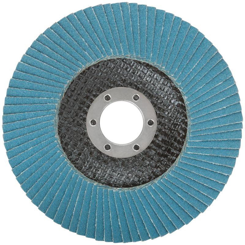 Тип 1 (Плоский). 80 лепестков. Для УШМ. Посадочный диаметр 22,2 мм. Для сухого шлифования и снятия краски с нержавеющей стали, инструментальной стали, чугуна, цветных металлов, пластика, дерева. Материал: абразивный слой - 100% цирконий, основа - х/б ткань, подложка - стекловолокно, обод - инструментальная сталь.