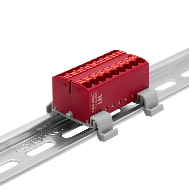 Описание: Блок распределительный с горизонт. адаптером на рейку шир. 35мм зажим push-in 18 точек подключения 2.5кв.мм красн. DKC DTP1-018-04SPUR-H