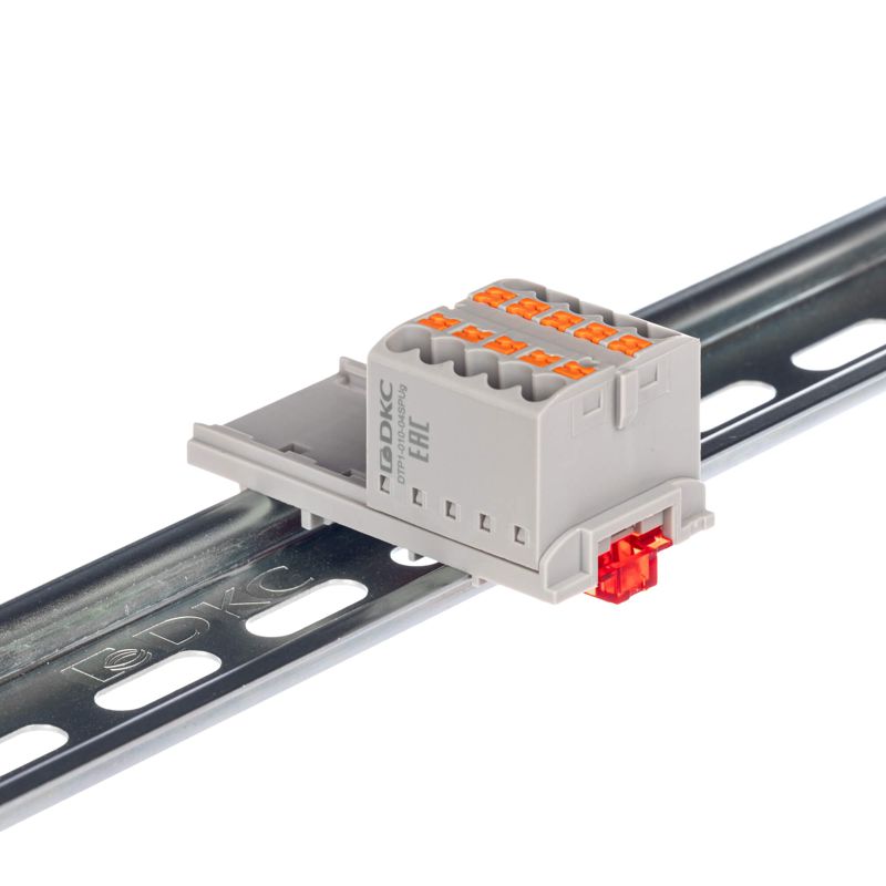 Блок распределительный с вертикал. адаптером на рейки шир. 15/35мм зажим push-in 10 точек подключения 2.5кв.мм сер. DKC DTP1-010-04SPUG-V - условия доставки