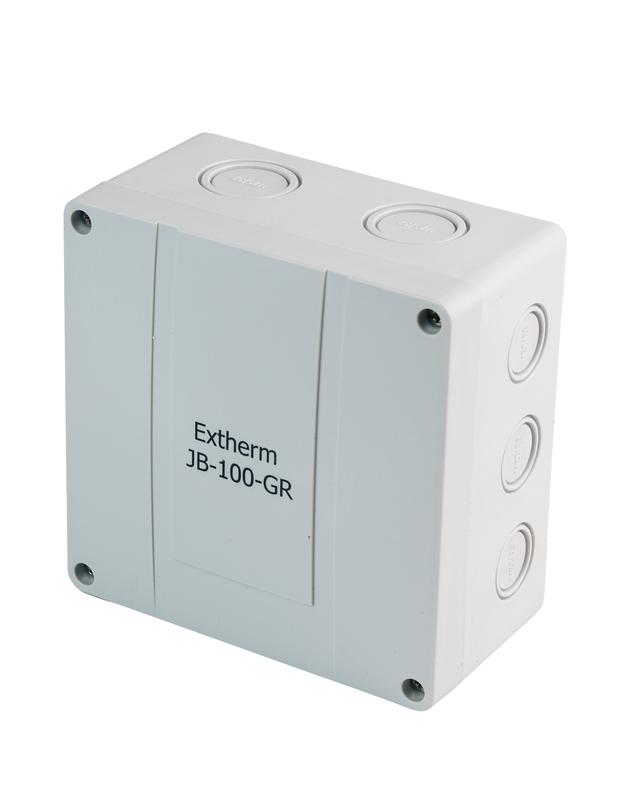 "Коробка Extherm JB-100-GR предназначена для подвода питания к нагревательным кабелям, разветвления линий нагревательных кабелей в