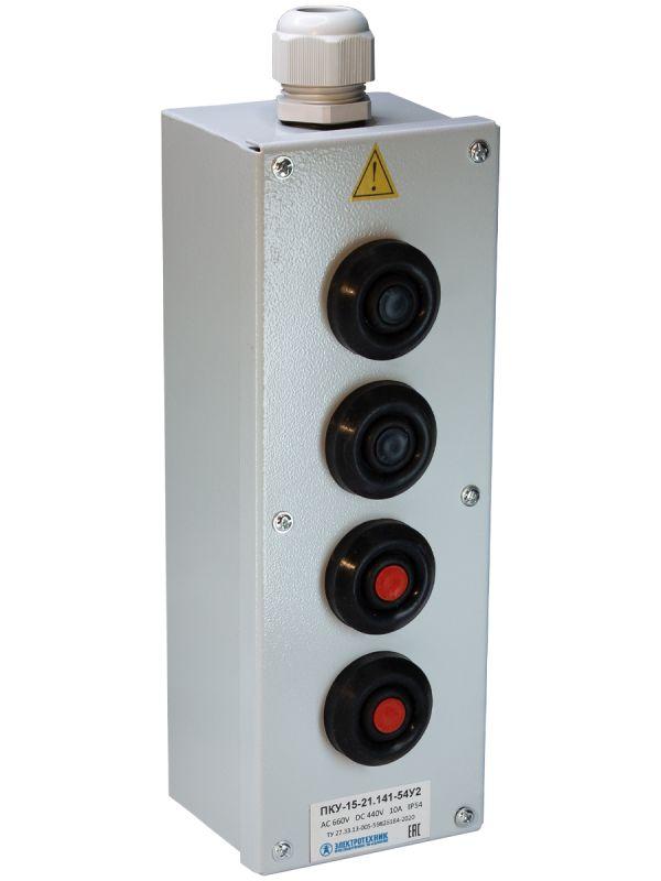 Описание: Пост кнопочный ПКУ 15-21.141-54 У2 (2хКЕ081/2 (1з+1р) черн. + 2хКЕ081/2 (1з+1р) красн. + PG-21) пост управления Электротехник ET054492