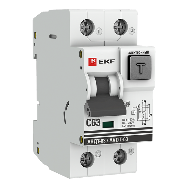 Выключатель автоматический дифференциального тока 2п C 63А 100мА тип A 6кА АВДТ-63 2мод. электрон. PROxima EKF DA63-63-100e - условия доставки