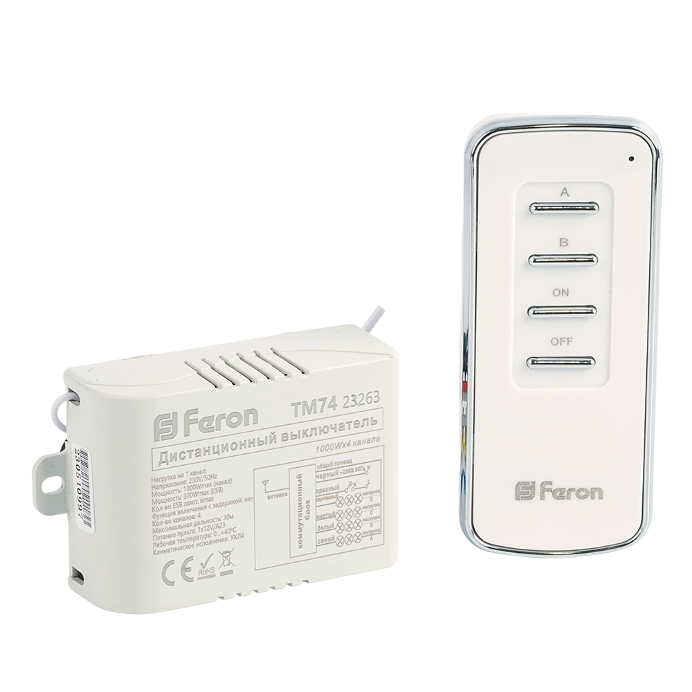 Дистанционный выключатель для светильников (4-х канальный ), FERON TM74, IP20, 230V, 1000W, 300W цвет белый, 100*55*25мм