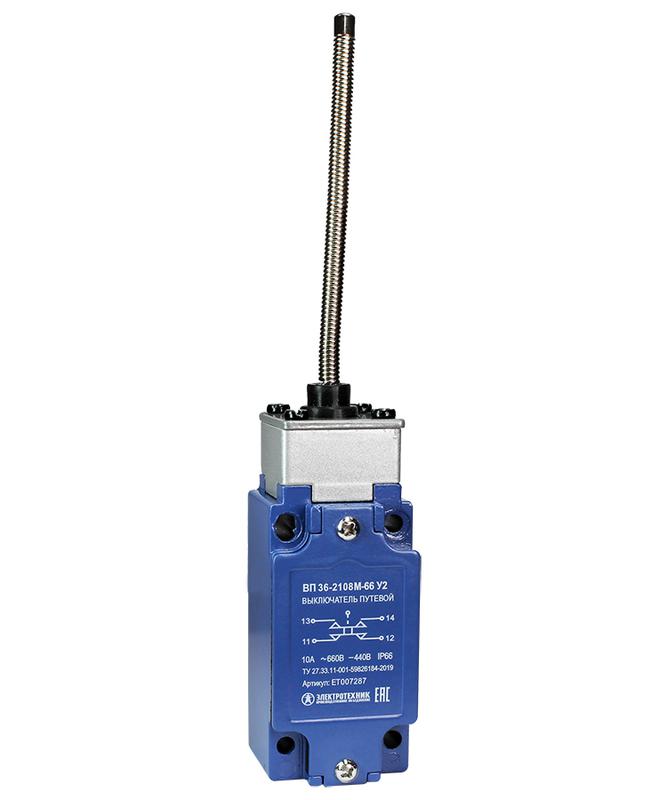 Описание: Выключатель путевой ВП 36-2108М-66 У2 1НО+1НЗ рычаг пружинный безинерционный 30х60мм без сальника 3А IP66 Электротехник ET007287
