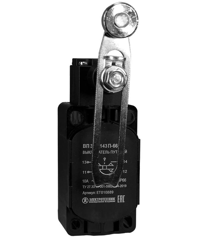 Описание: Выключатель путевой ВП 36-2143П-66 У2 1НО+1НЗ рычаг со стальным роликом регулир. по длине безинерционный 30х60мм без сальника 3А IP66 Электротехник ET010889