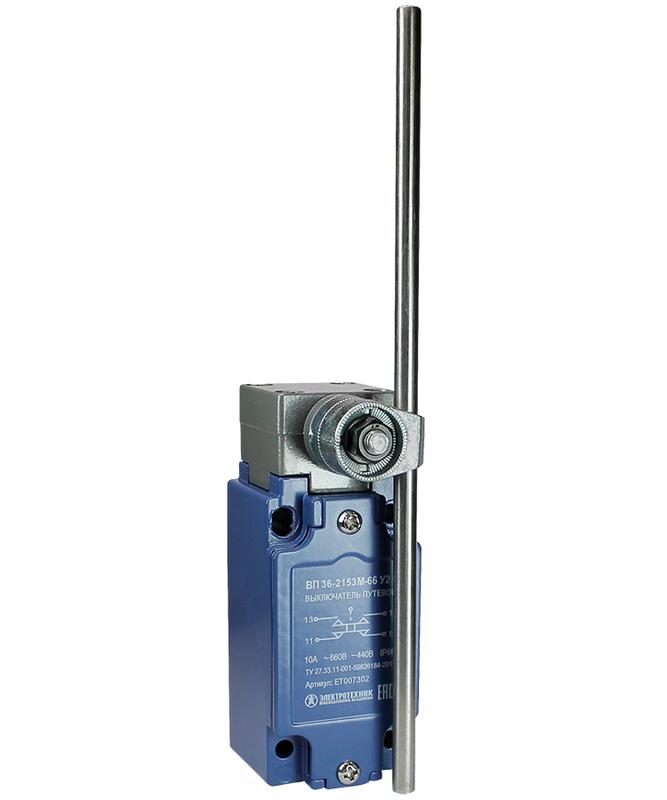 Описание: Выключатель путевой ВП 36-2153М-66 У2 1НО+1НЗ рычаг стальной круглый регулир. по длине безинерционный 30х60мм без сальника 3А IP66 Электротехник ET007302