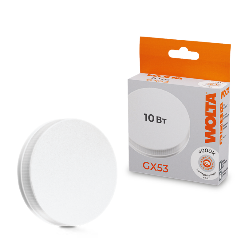 Светодиодные лампы WOLTA производятся на ведущем заводе в области энергосбережения, используя передовые технологии, новейшее оборудование, отбор комплектующих и жесткий контроль качества. Мощность ламп 7,5Вт, 10Вт и 12Вт. Представлены в трёх цветовых температурах 3000К (тёплый), 4000К (нейтральный) и 6500К (холодный). Благодаря компактным размерам ламп GX53, их можно использовать в светильниках, установленных в подвесные и натяжные потолки с минимальным внутрипотолочным пространством.