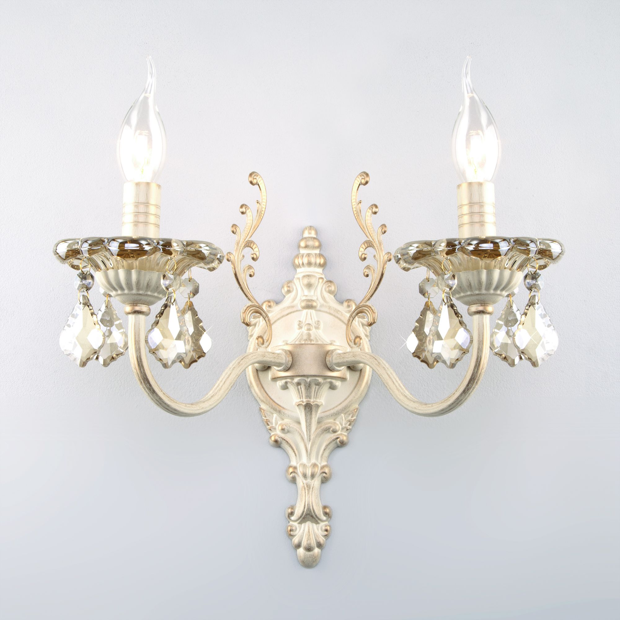 Бра с тонированным хрусталем 32812 белый с золотом тонированный хрусталь двухрожковый станет ярким световым акцентом в классических интерьерах и создаст качественное освещение на площади 4 м². Эффектные чаши подсвечников украшены хрустальными подвесками, которые искрятся в лучах света, наполняя помещение выразительным блеском. В качестве источника света используются сменные лампы типа свеча на ветру с цоколем E14. Патрон рассчитан на максимальную мощность ламп накаливания 60 Вт.