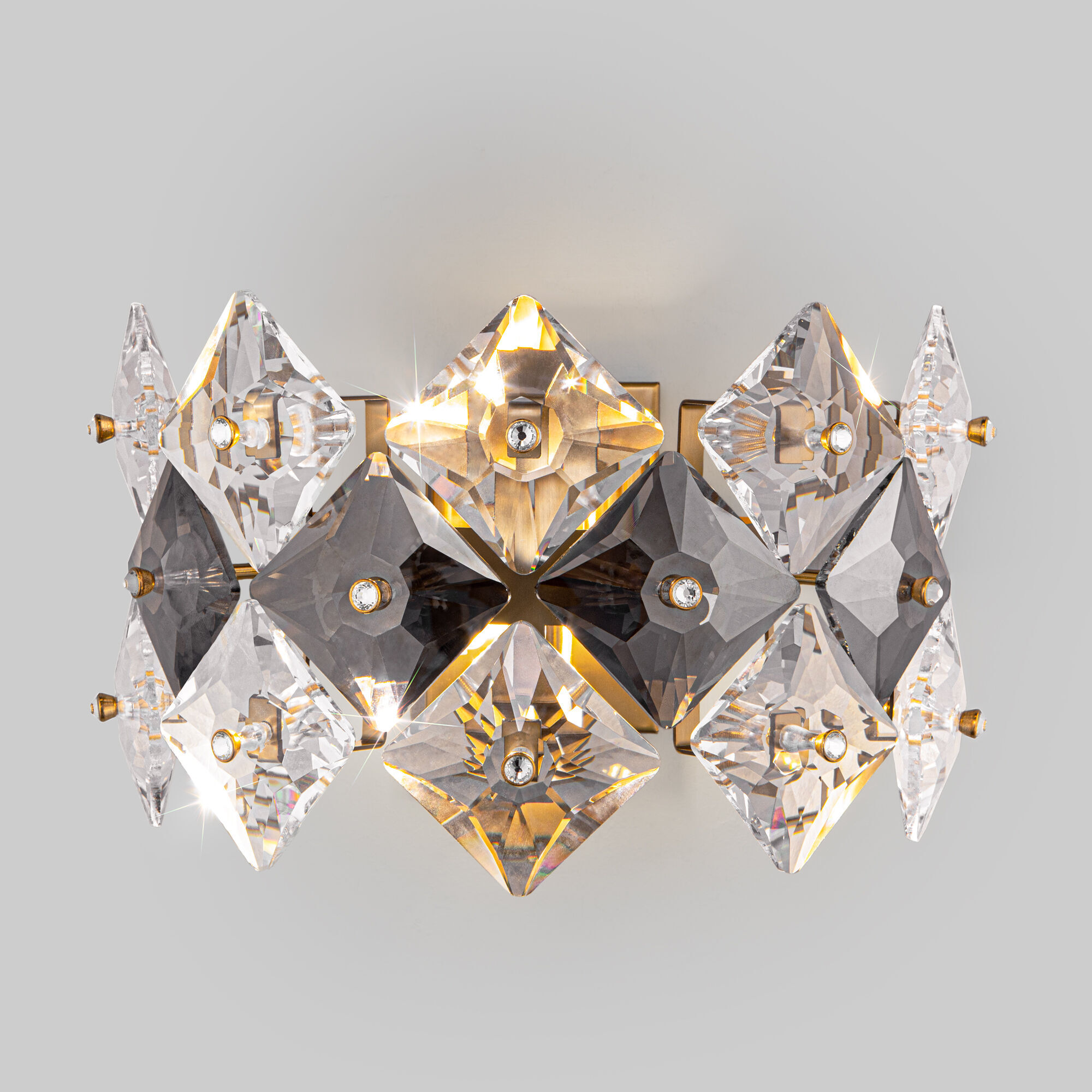 Rubis — элегантный светильник, наполняющий пространство роскошью. Изысканная арматура цвета латунь усеяна хрусталем Strotskis, который привносит атмосферу торжества и изысканности. Сочетание дымчатого и прозрачного хрусталя строгой геометрической формы добавляет акценты в интерьер. Лучи света, попадая на хрусталики, создают оригинальную игру света и бликов.