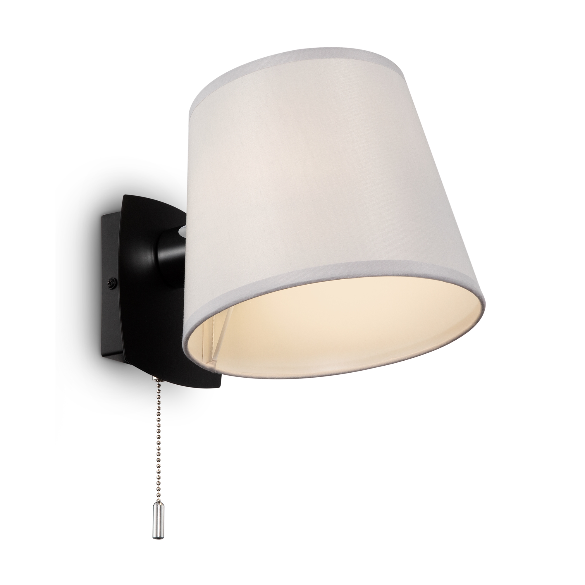 Металлическая арматура. Три цветовых решения: белый и хром, черный и хром, хром. Абажур из текстиля и льна, нанесенного на ПВХ. Цвета — бежевый, серый, белый. Источник света в подвесных моделях скрыт под матовым стеклом. Торшеры и настольные лампы с регулируемым кронштейном. Лампа с цоколем Е27.