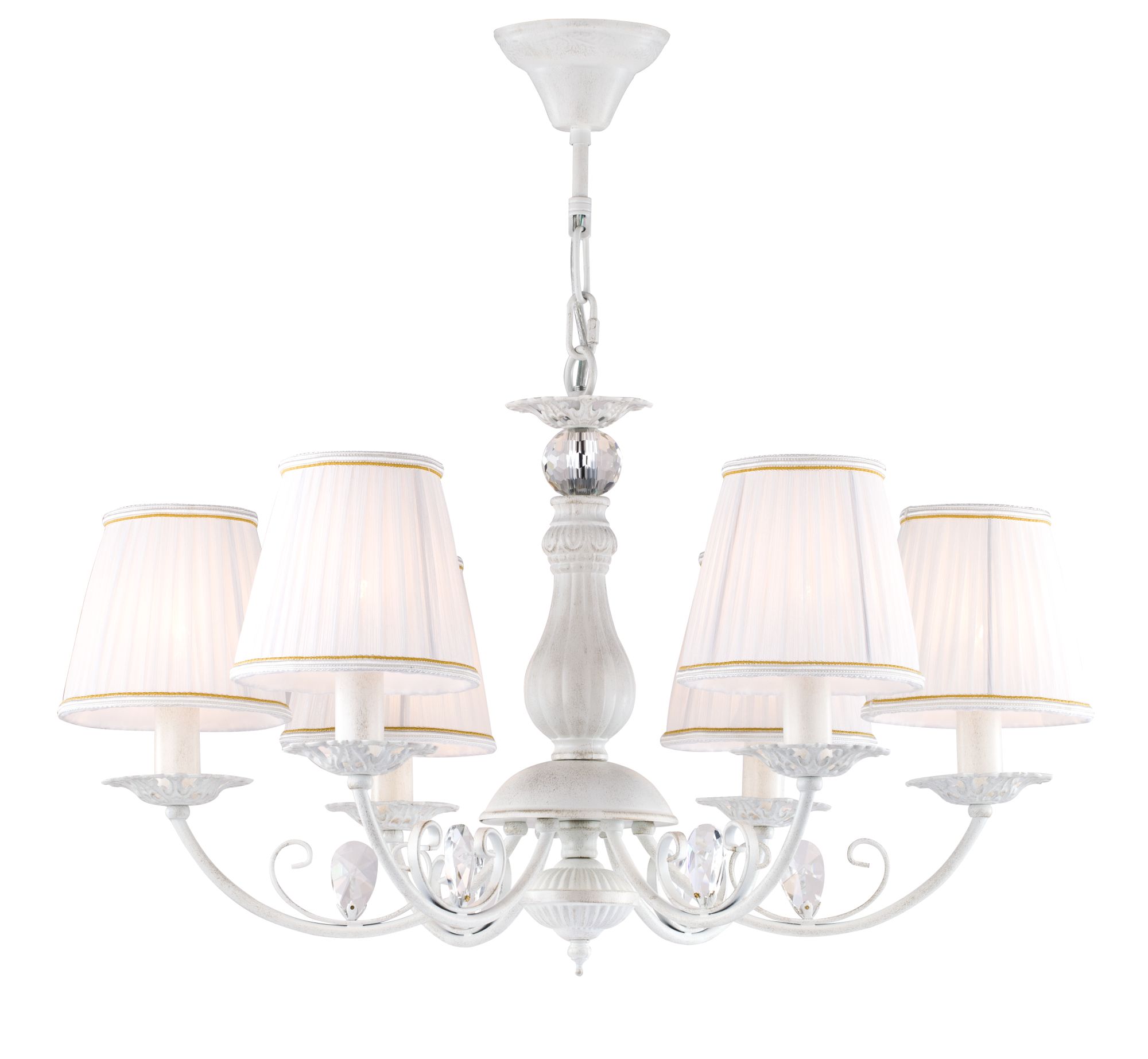 Люстра украшена круглым прозрачным граненым кристаллом, а рожки декорированы кристаллами. Основание люстры и декоративная чаша крепления рожков дополнены патинированным орнаментом. Белоснежные абажуры украшены золотой тесьмой.