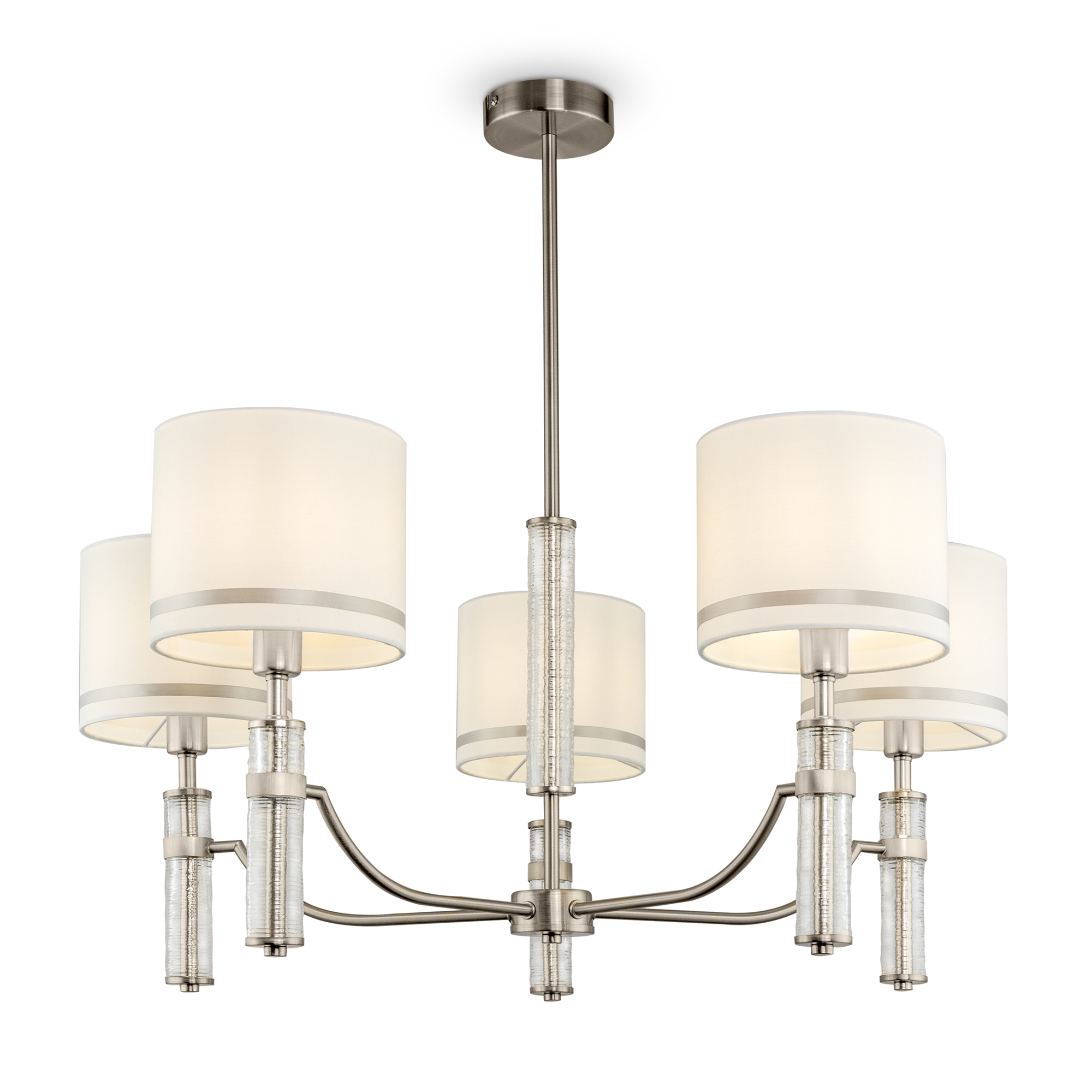 Эстетика неоклассицизма объединила светильники серии Albero – люстру на 7/5 ламп, бра и настольную лампу. Металлическая арматура цвета никеля подчеркнута оригинальным цилиндрическим декором из рельефного стекла – за счёт этого создается ощущение невесомости и легкости конструкции. Кремовые тканевые абажуры, обрамленные кантом, венчают композицию, придавая ей завершенный вид и даря мягкий, слегка приглушенный свет. Регулируемый подвес позволяет настроить оптимальную высоту люстры в зависимости от параметров помещения. Широкий выбор светильников в серии дарит возможность организовать комплексное, многоуровневое освещение в единой выдержанной стилистике.