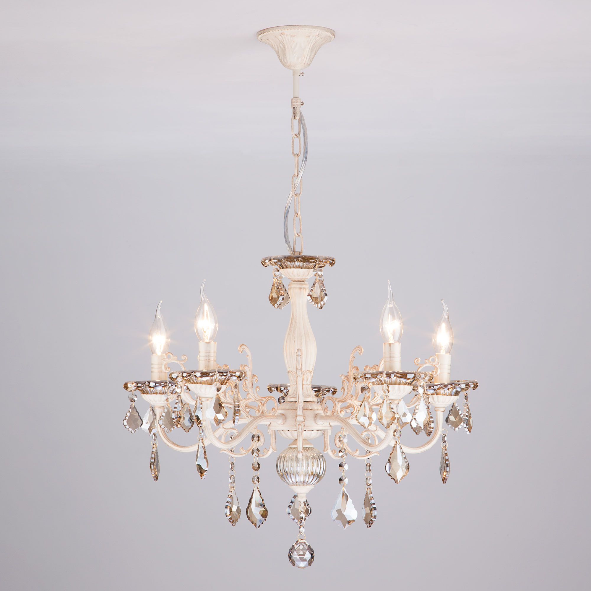 Классическая хрустальная люстра на 5 рожков в цвете белый с золотом тонированный хрусталь преобразит потолочное пространство и создаст в вашем помещении комфортное полноценное освещение на площади 24 м кв. Изящные формы и классический стиль добавят вашей гостиной утонченного аристократизма.