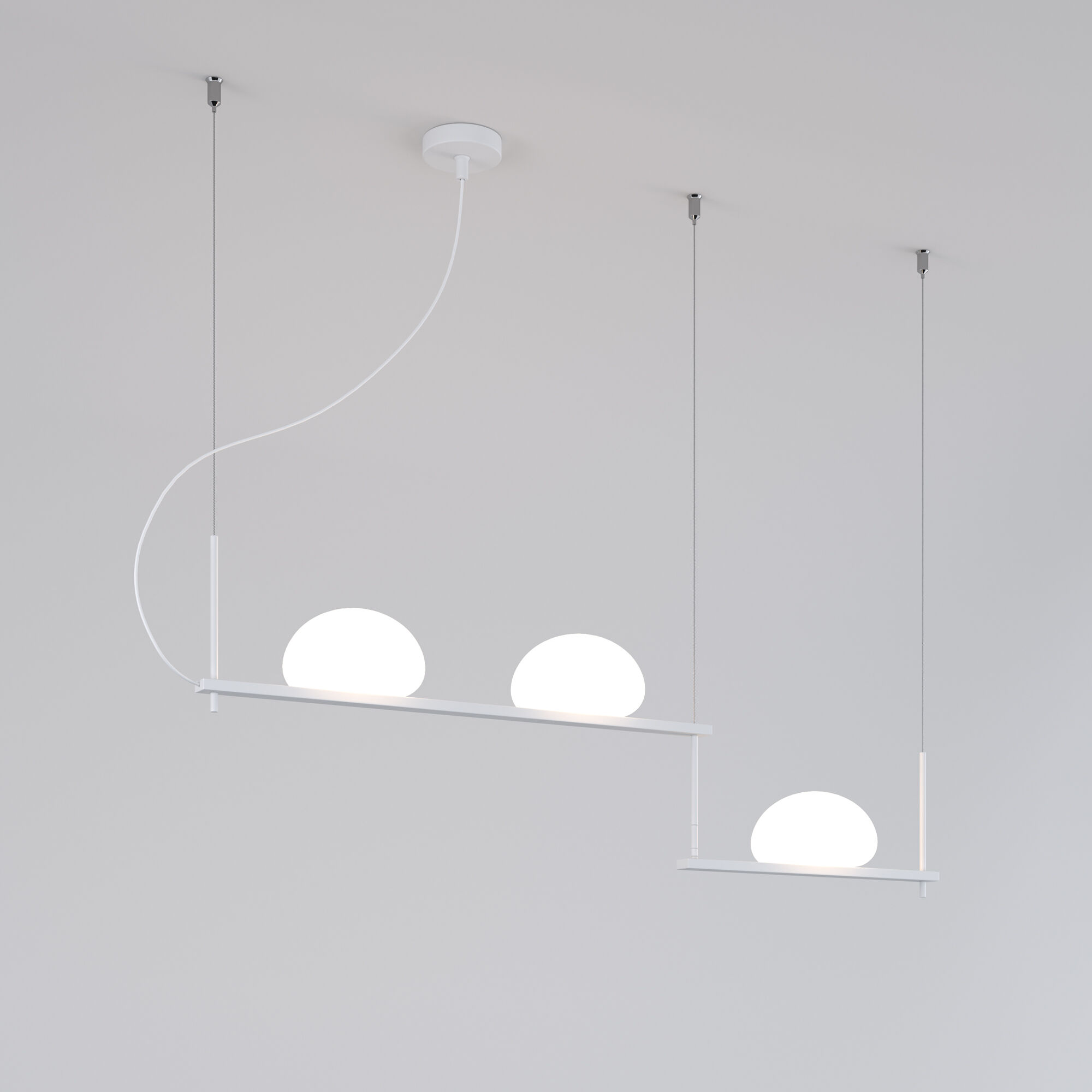 Светильник со стеклянными плафонами оснащен системой регулировки высоты подвеса, позволяющей размещать изделие на разных уровнях, уменьшая или увеличивая угол рассеивания светового потока. Подвесной светильник легко устанавливается на натяжных потолках при помощи монтажной планки.