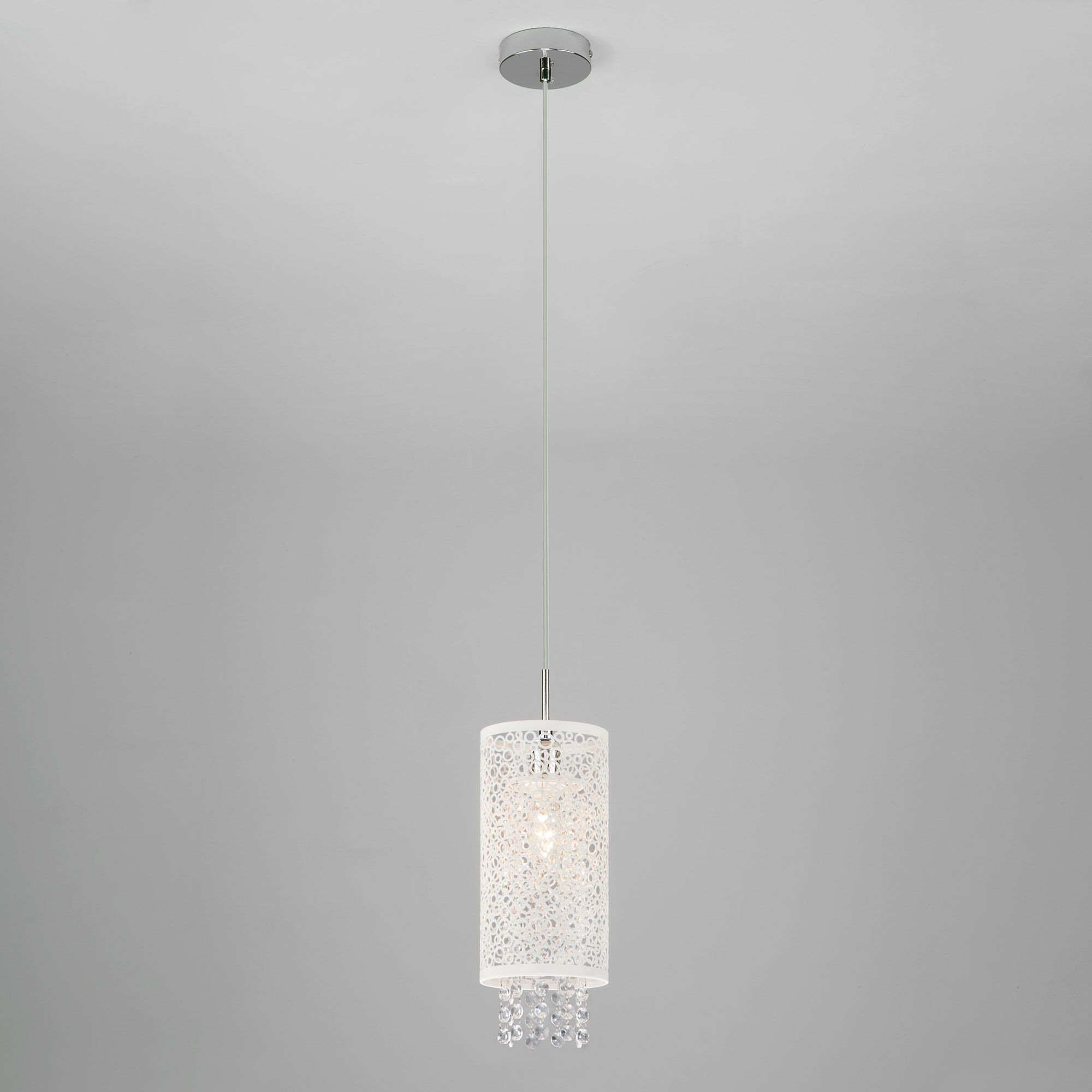 Светильник с металлическим плафоном в белом цвете, украшенным декоративным хрусталем, оснащен системой регулировки высоты подвеса, позволяющей размещать изделие на разных уровнях, уменьшая или увеличивая угол рассеивания светового потока. Данный светильник легко устанавливается на потолке при помощи монтажной планки.
