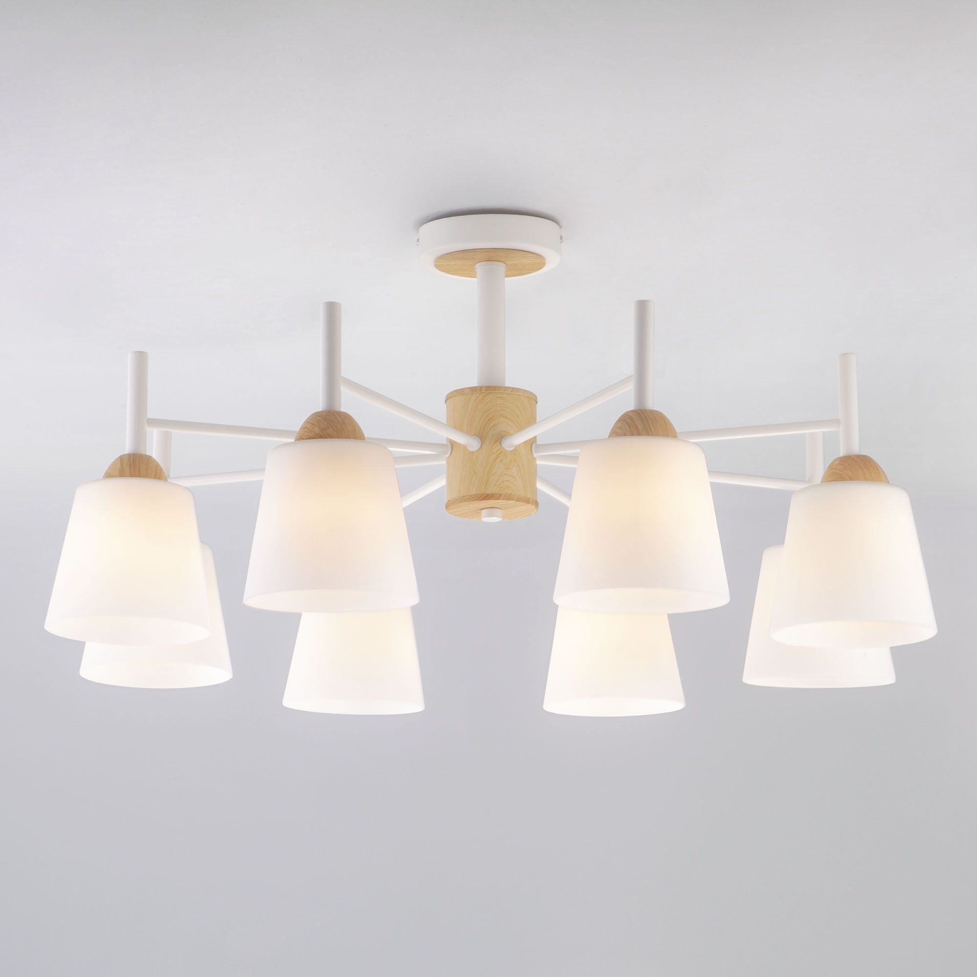 Люстра дополнена матовыми стеклянными плафонами обеспечивающими мягкий, рассеянный свет создавая уютную и комфортную атмосферу в вашей гостиной, спальне или столовой, а плавные линии белого металлического каркаса гармонично сочетающиеся с абажурами конической формы и декоративными элементами, имитирующими натуральное дерево, добавляют нотку скандинавского стиля.