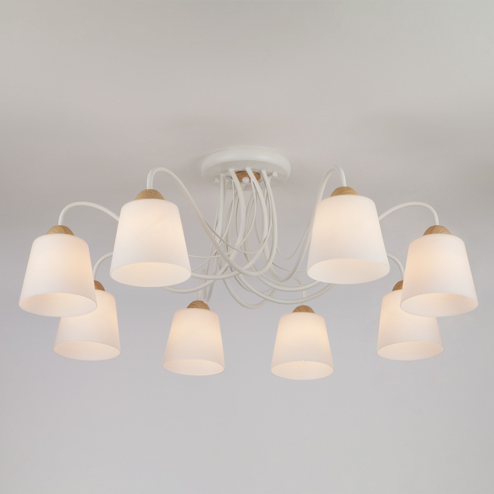 Люстра дополнена матовыми стеклянными плафонами обеспечивающими мягкий, рассеянный свет создавая уютную и комфортную атмосферу в вашей гостиной, спальне или столовой, а плавные линии белого металлического каркаса гармонично сочетающиеся с абажурами конической формы и декоративными элементами, имитирующими натуральное дерево, добавляют нотку скандинавского стиля.