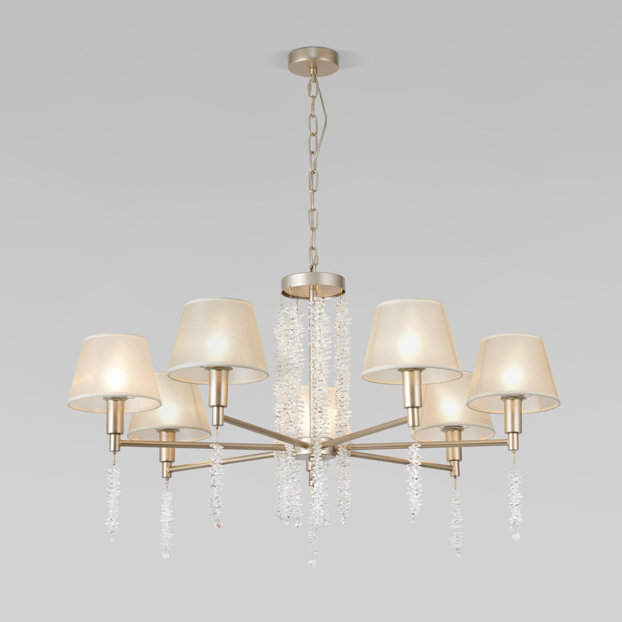 В люстре рекомендуется использовать сменные лампы накаливания с цоколем Е14 с максимальной мощностью 40 Вт. В производстве люстры использовали высококачественный металл с надежным защитным покрытием и закаленное стекло.