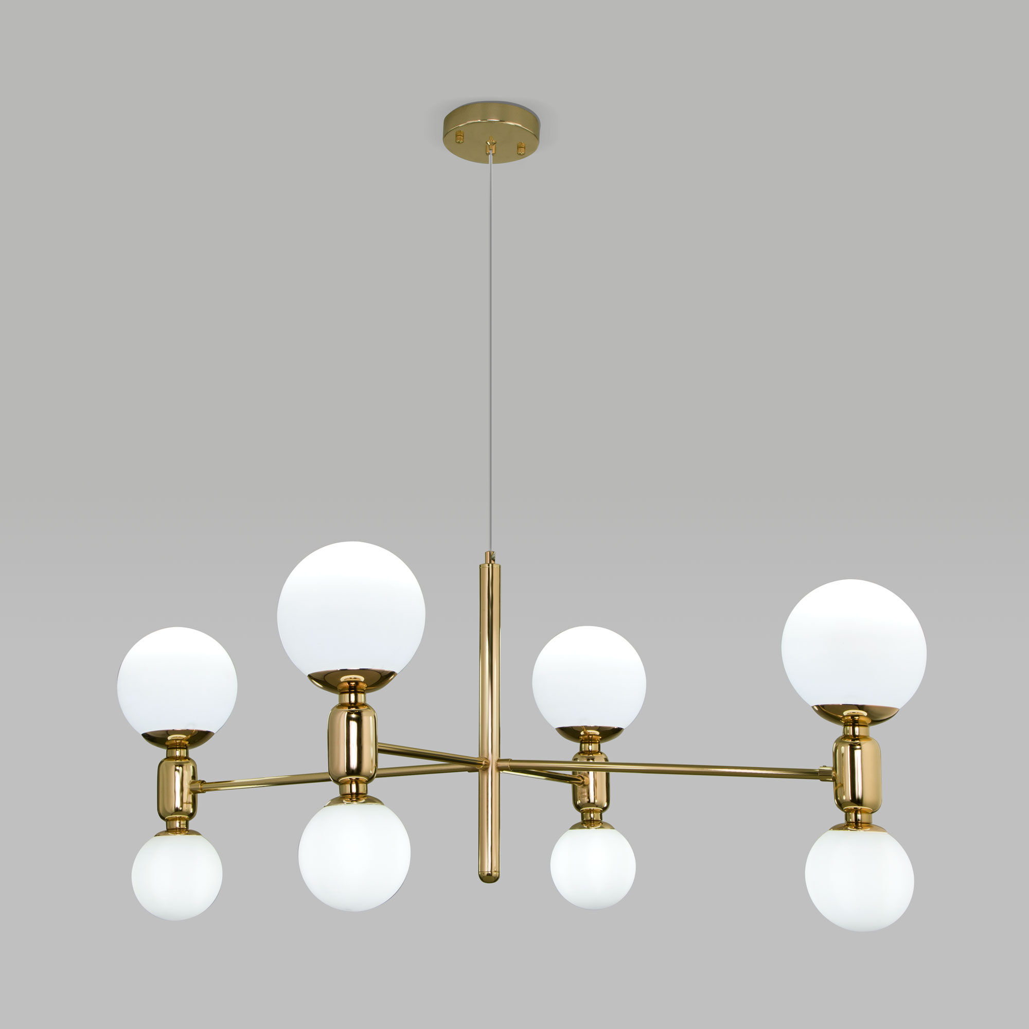 <strongПодвесная люстра Bubble в цвете золото<strong – это выразительное сочетание геометрических форм и лаконичного дизайна. Круглые плафоны белого цвета разных диаметров формируют мягкий равномерный свет. Светильник рассчитан на 8 сменных ламп. Люстра Bubble добавит уникальную атмосферу в интерьер спальни, гостиной или кухни.