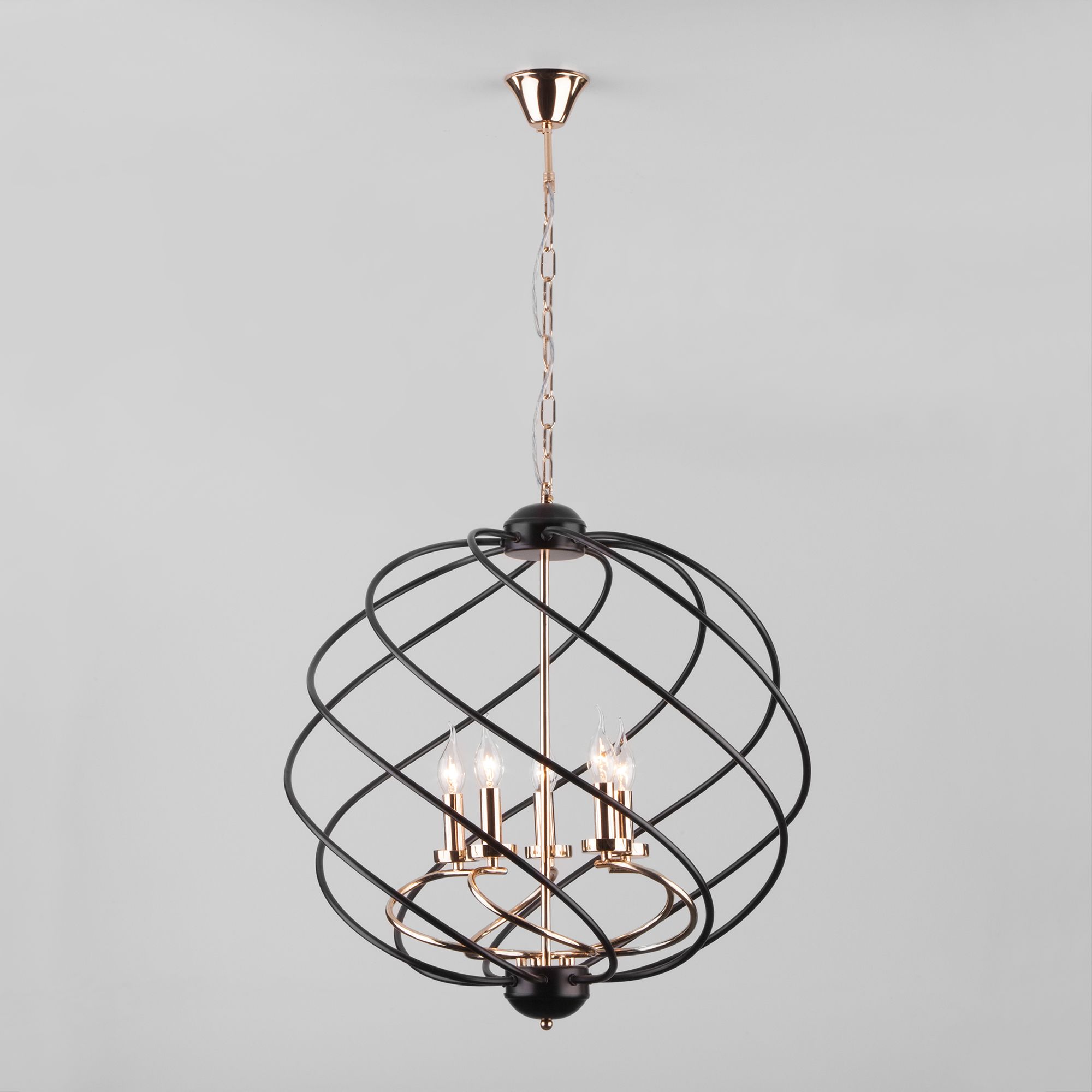 Пятирожковый светильник без плафона заключенный в спиральный металлический шар с открытыми патронами, гармонично смотрится с лампами свеча и свеча на ветру, такой дизайн увеличивает угол рассеивания светового потока. Подвесной светильник просто устанавливается на любых потолках при помощи монтажного крюка.
