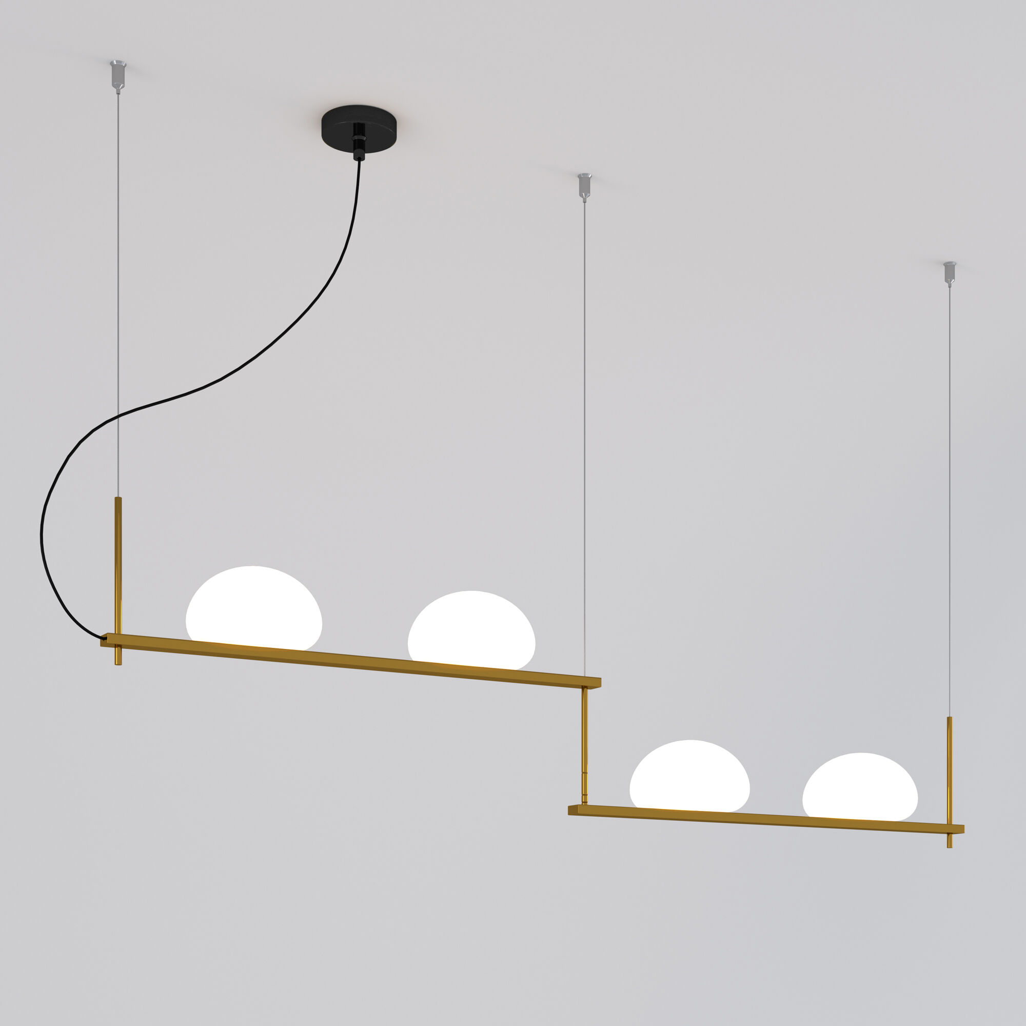 Светильник со стеклянными плафонами оборудован системой регулировки высоты подвеса, позволяющей размещать изделие на разных уровнях, уменьшая или увеличивая угол рассеивания светового потока. Подвесной светильник просто устанавливается на натяжных потолках при помощи монтажной планки.