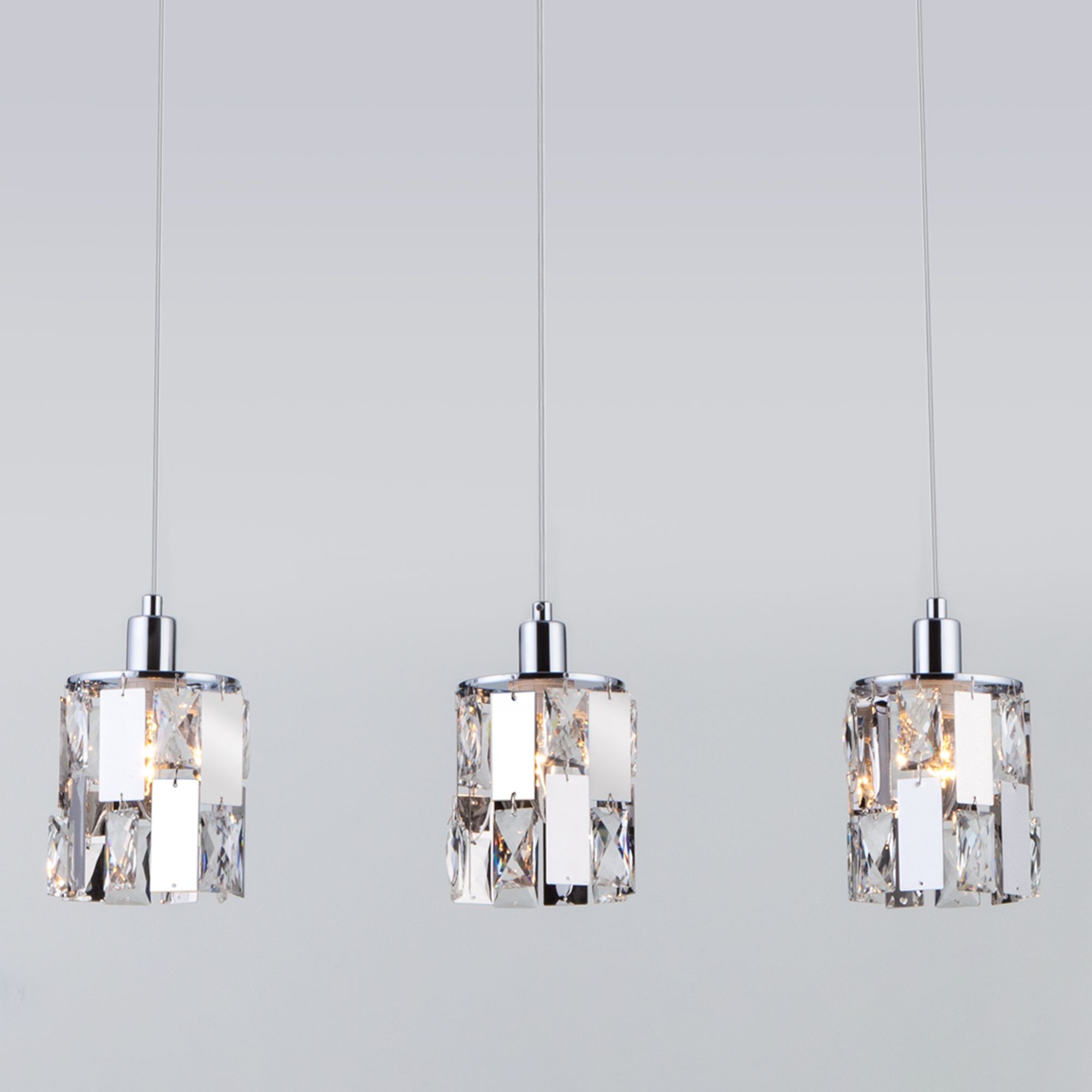 Светильник с хрустальными плафонами, представленный в изящной простоте форм, оснащен системой регулировки высоты подвеса, позволяющей размещать изделие на разных уровнях, уменьшая или увеличивая угол рассеивания светового потока. Данный светильник легко устанавливается на потолке при помощи монтажной планки.
