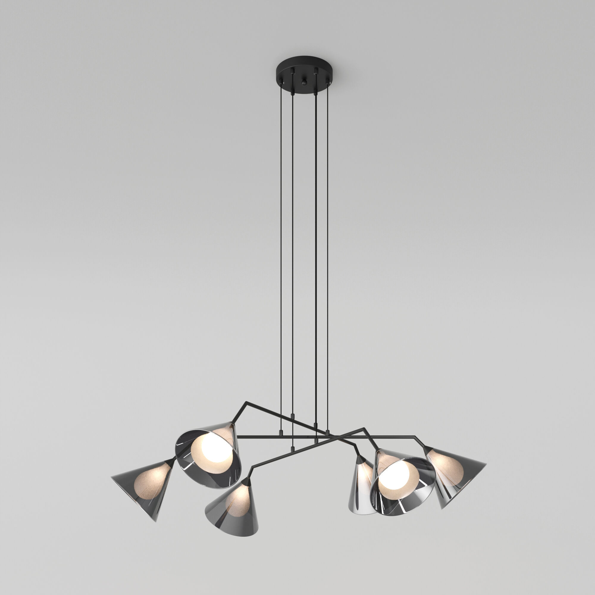 Конусовидные дымчатые плафоны метафорически обнимают округлые молочные плафоны, создавая атмосферу загадочности и уюта. Утонченная черная арматура придает изделиям лёгкость, позволяя им гармонично вписываться в разнообразные стилистические решения.