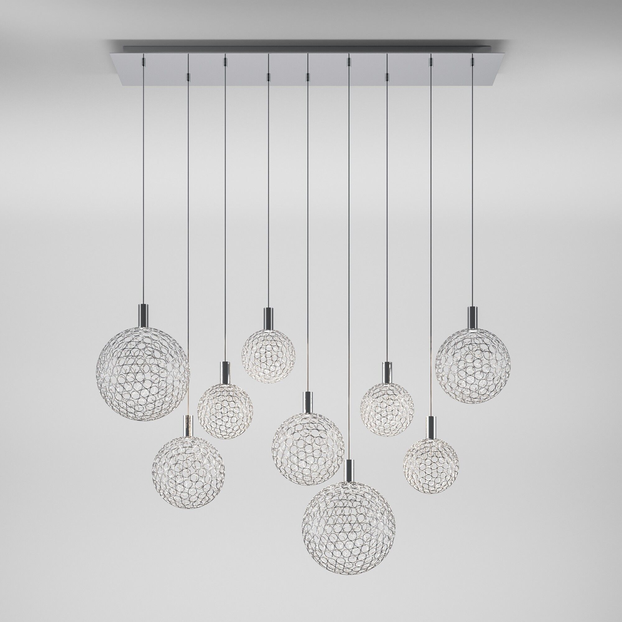 Светильники Gemini представляют истинное произведение искусства, где универсальная сферическая форма плафона, выполненная из изящных металлических колец в цвете хром, создает завораживающий световой узор. Коллекция органично вписывается как в эклектичные, так и в современные интерьеры, добавляя им изысканность.