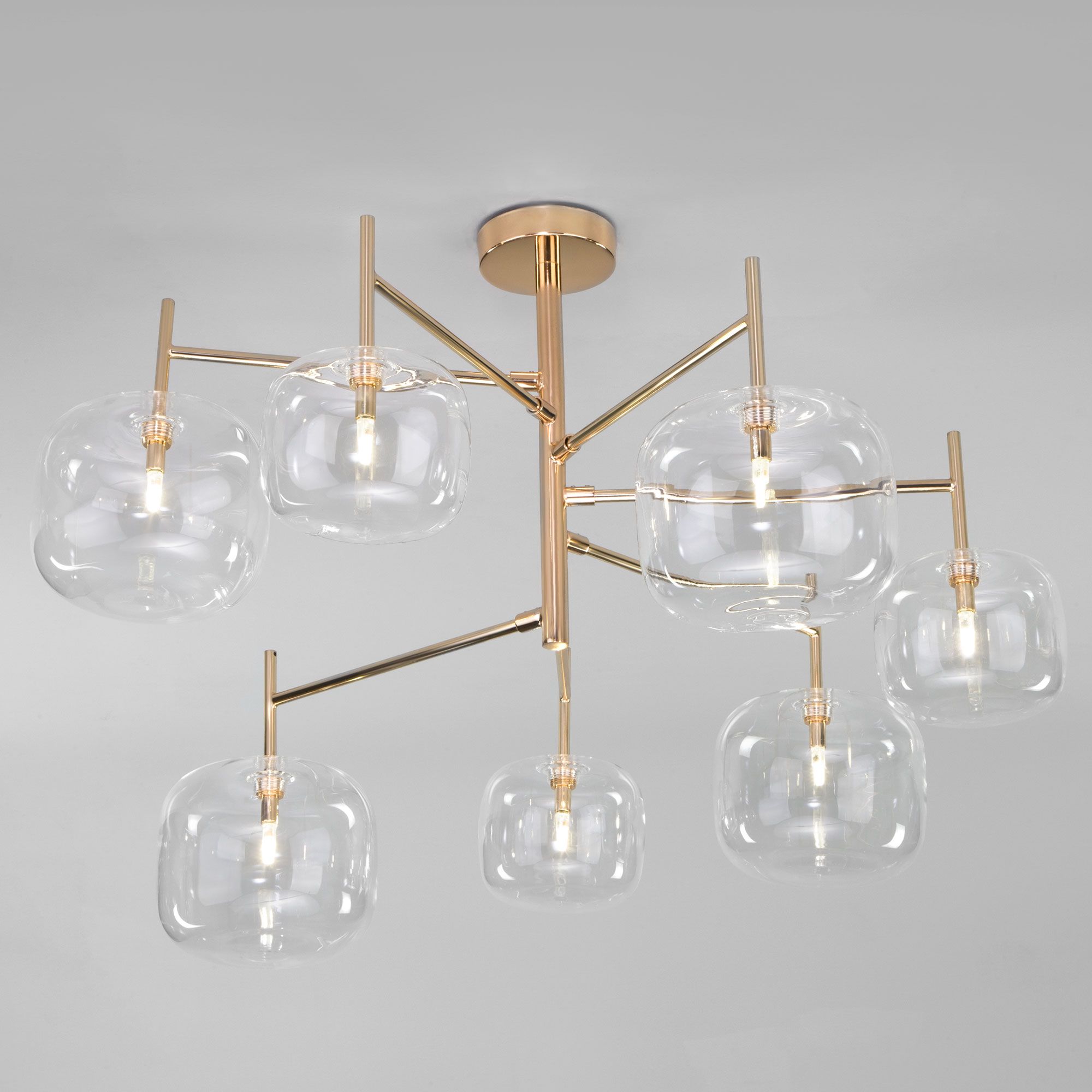 Организовать освещение вам поможет эффектная потолочная люстра со стеклянными плафонами в золотом цвете. Простые эргономичные формы и умеренные тона станут прекрасным дополнением для вашего интерьера.