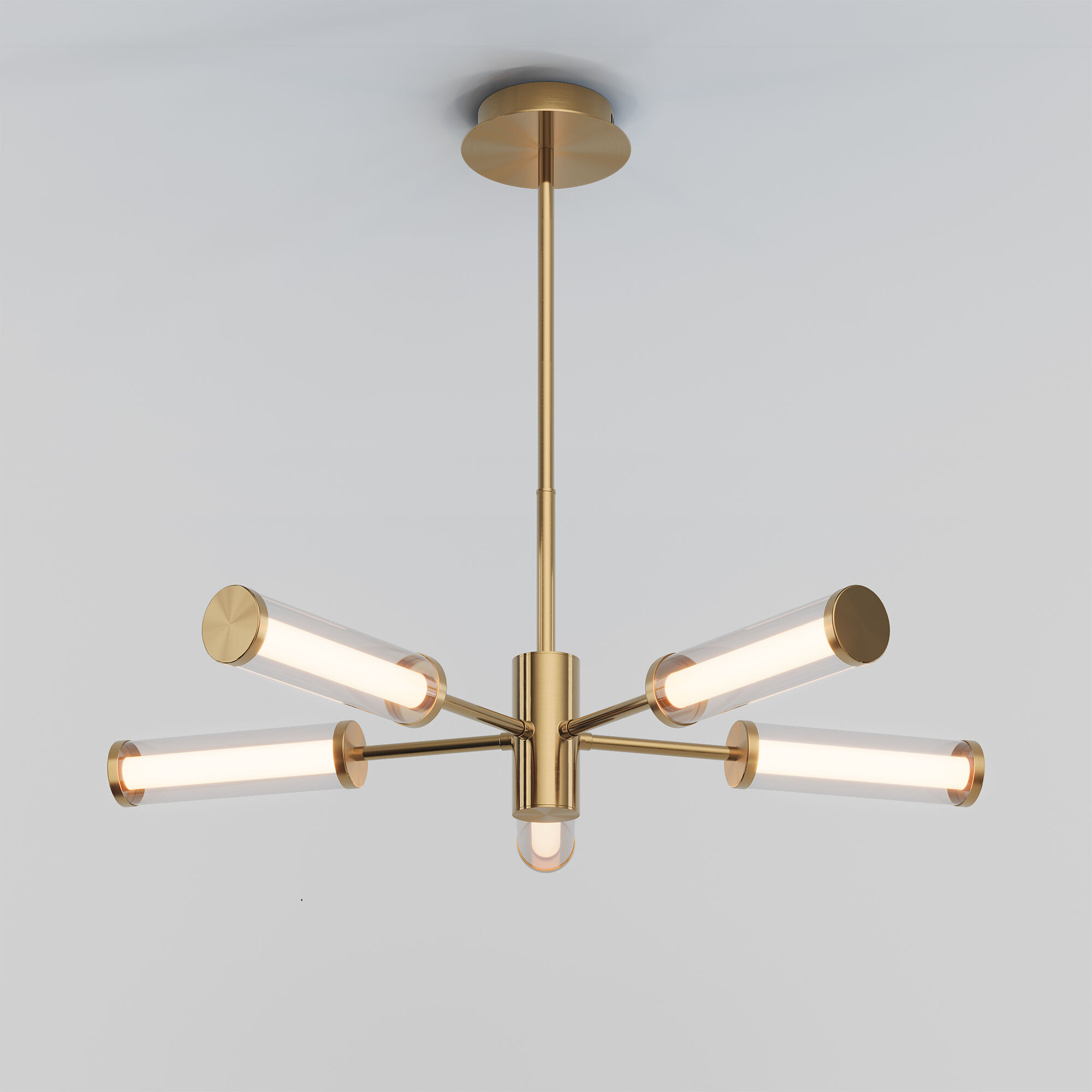 Белые трубчатые плафоны, дополненные прозрачным стеклом, создают эффект визуального парения, мягко рассеивая свет. Элементы по форме напоминают яркие векторные стрелы, которые указывают путь к инновационным идеалам, соединяя функциональность с эстетической выразительностью.