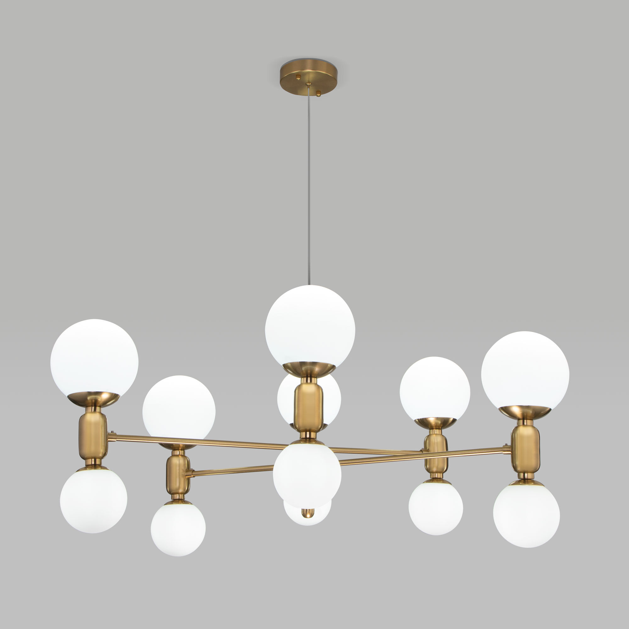 <strongПодвесная люстра Bubble в цвете латунь<strong – это выразительное сочетание геометрических форм и лаконичного дизайна. Круглые плафоны белого цвета разных диаметров формируют мягкий равномерный свет. Светильник рассчитан на 12 сменных ламп. Люстра Bubble добавит уникальную атмосферу в интерьер спальни, гостиной или кухни.