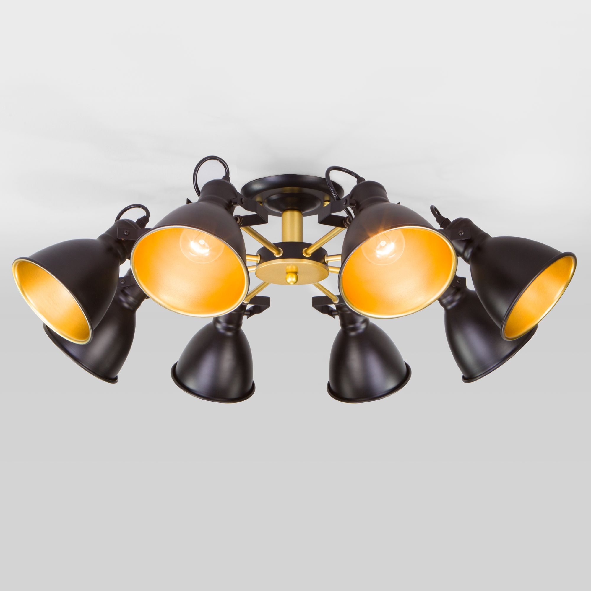 В восьмирожковой люстре используются сменные лампы с цоколем E27, рассчитанные на максимальную мощность 60 Вт. Потолочный светильник оснащен металлическими плафонами с поворотным механизмом, позволяющим направлять световой поток в нужном направлении. В производстве люстры использован высококачественный металл с надежным защитным покрытием.