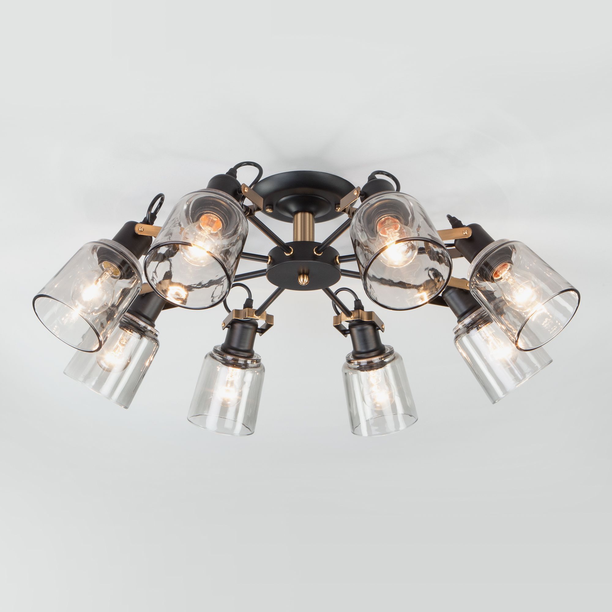 В восьмирожковой люстре используются сменные лампы с цоколем E27, рассчитанные на максимальную мощность 60 Вт. Потолочный светильник оснащен стеклянными плафонами и поворотным механизмом, позволяющим направлять световой поток в нужном направлении. В производстве люстры использован высококачественный металл с надежным защитным покрытием и закаленное стекло.