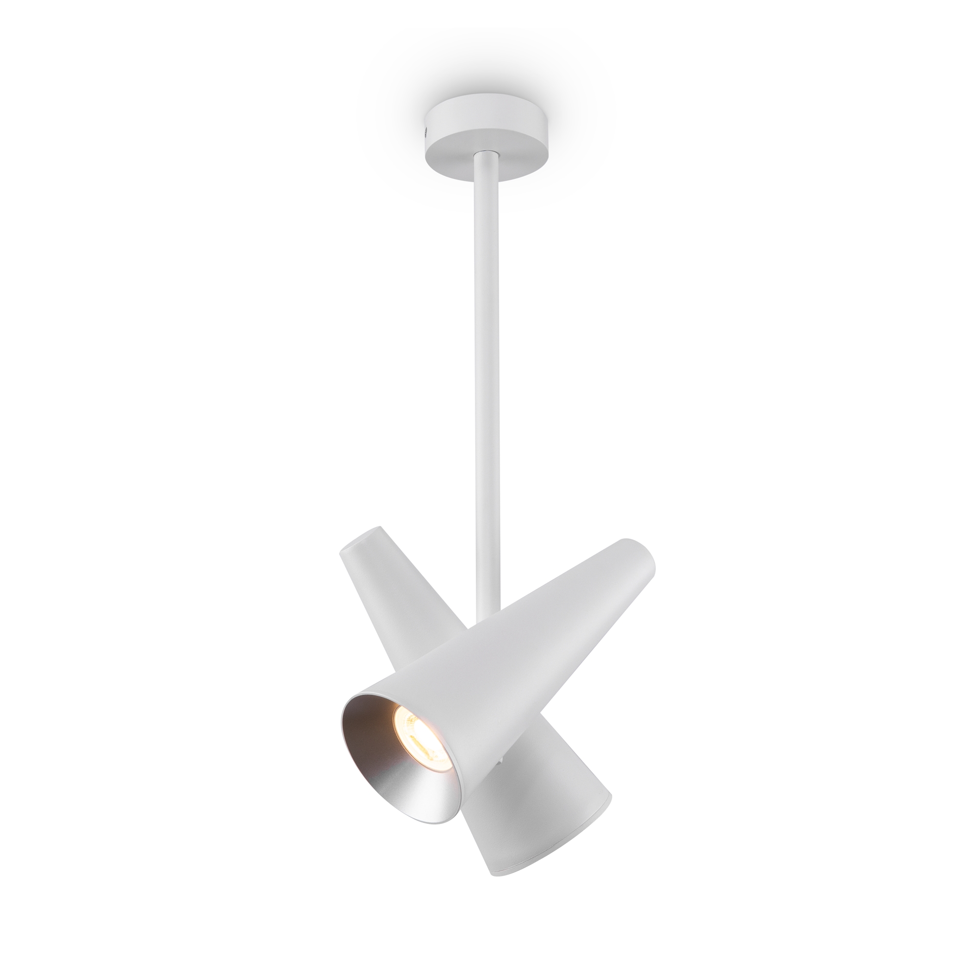 Металлическая арматура в двух оттенках: белый и черный. Плафоны-конусы выполнены из алюминия. Оттенки: белый, латунь. Рожки вращаются, можно менять направление света. Высота регулируется с помощью разборного центрального элемента.