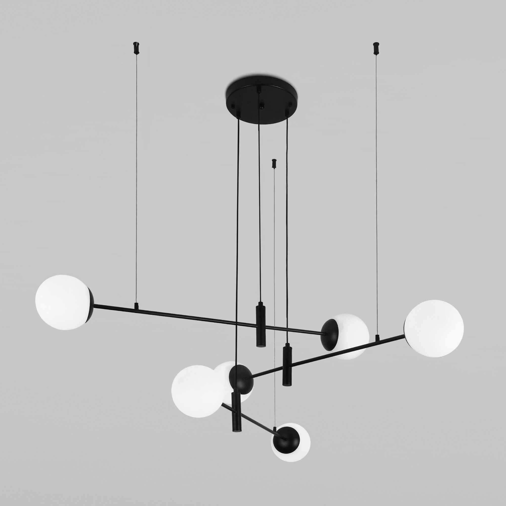 Подвесная люстра Planet вдохновлена хаотичным расположением планет в космосе и строгой геометрией форм. Открытая конструкция на тонких подвесах будто парит в воздухе, создавая ощущение невесомости и динамики элементов. Шесть белых матовых плафонов в форме шара мягко рассевают свет.