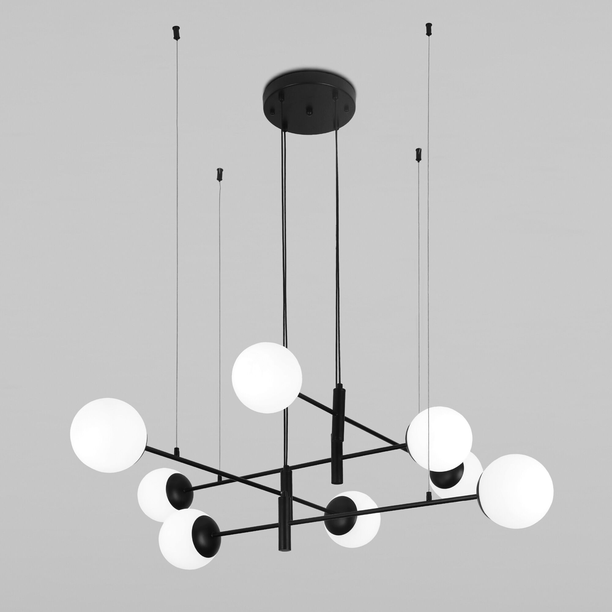 Подвесная люстра Planet вдохновлена хаотичным расположением планет в космосе и строгой геометрией форм. Открытая конструкция на тонких подвесах будто парит в воздухе, создавая ощущение невесомости и динамики элементов. Восемь белых матовых плафонов в форме шара мягко рассевают свет.