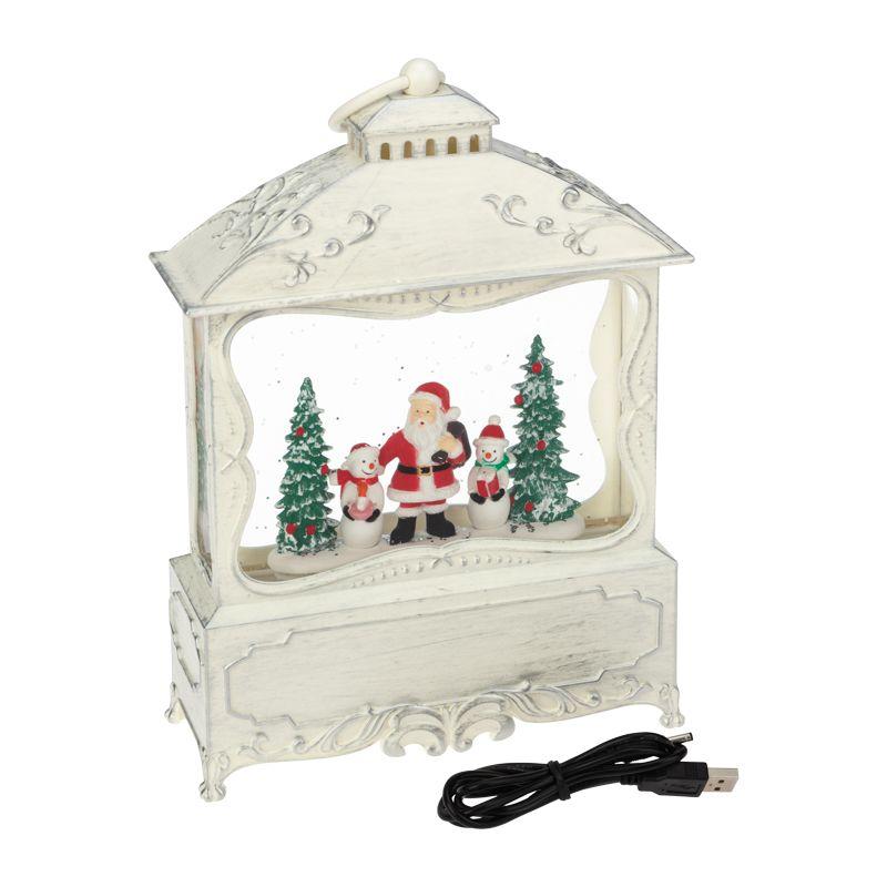 Портативный фонарь питается от 3 батареек типа АА или от сетевого блока через USB-шнур. Вьюга, создаваемая сверкающими блестками, кружится внутри колбы и подсвечивается белыми диодами. Декоративный фонарь станет прекрасным подарком детям и взрослым, принесет атмосферу зимней сказки в ваш дом.