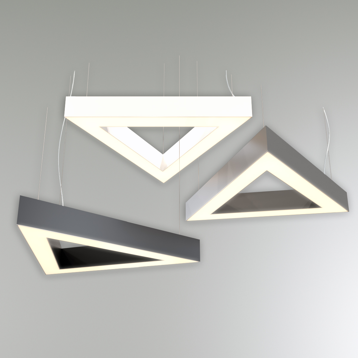 Подвесные светодиодные светильники серии RVE-LBX. Цена за светильник без покраски, цвет корпуса алюминий. Дополнительно можно заказать покраску в любой цвет, диммировние, аварийный блок питания, RGB и RGBW свечение. RVE-LBX-HOLE-TRIO-1800-P (треугл. с отв. 1800x1559x100мм S80мм 128Вт 3000K черный ) светильник имеет мощность 128 вт, цвет свечения Теплый белый 3000K.