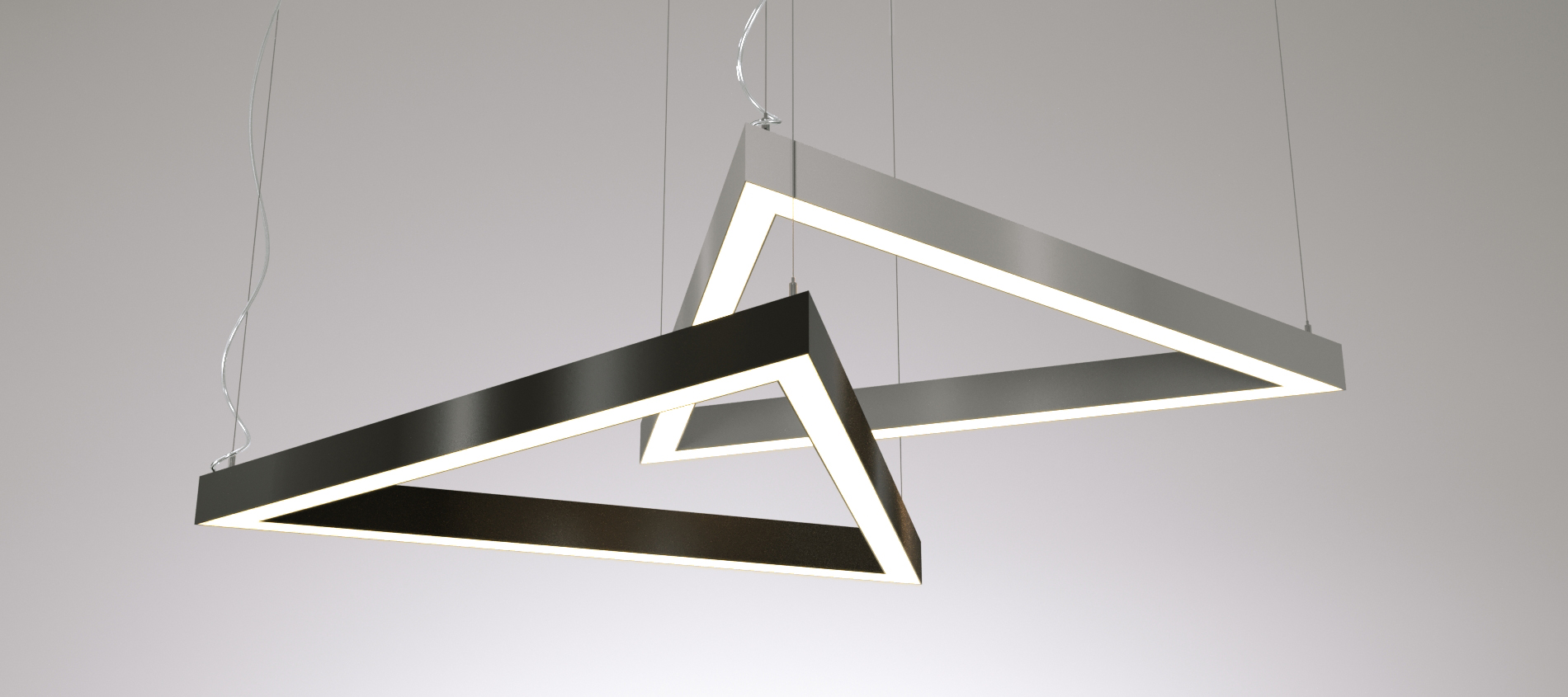Подвесные светодиодные светильники серии RVE-PLS5070 (фигурные). Цена за светильник без покраски, цвет корпуса алюминий. Дополнительно можно заказать покраску в любой цвет, диммировние, аварийный блок питания, RGB и RGBW свечение. RVE-PLS5070-TRIO-1488-P (треугольник 1488x1289мм сег. 1488мм 50x70мм 108Вт 5000) светильник имеет мощность 108 вт, цвет свечения Холодный белый 5000K.