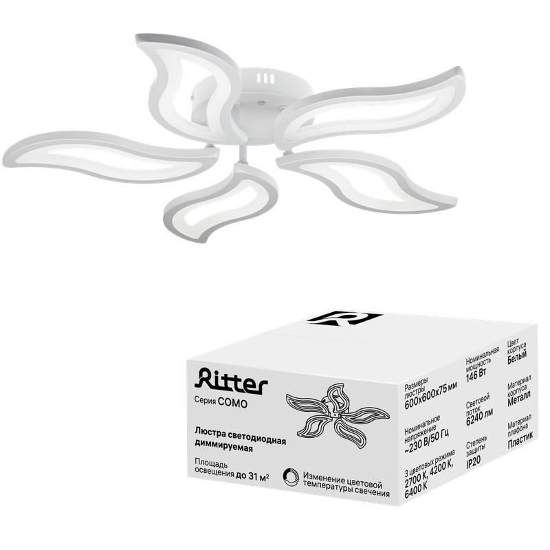 Люстра потолочная светодиодная диммируемая COMO 600х600х75мм 146Вт 2700К/4200К/6400К 31кв.м бел. Ritter 51934 2 - условия доставки